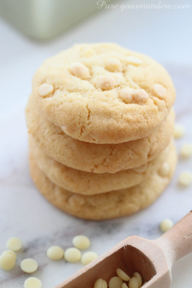 La recette de mes cookies au chocolat blanc. Épais et moelleux, au chocolat ivoire et aux pépites de chocolat blanc, en fiche à imprimer.