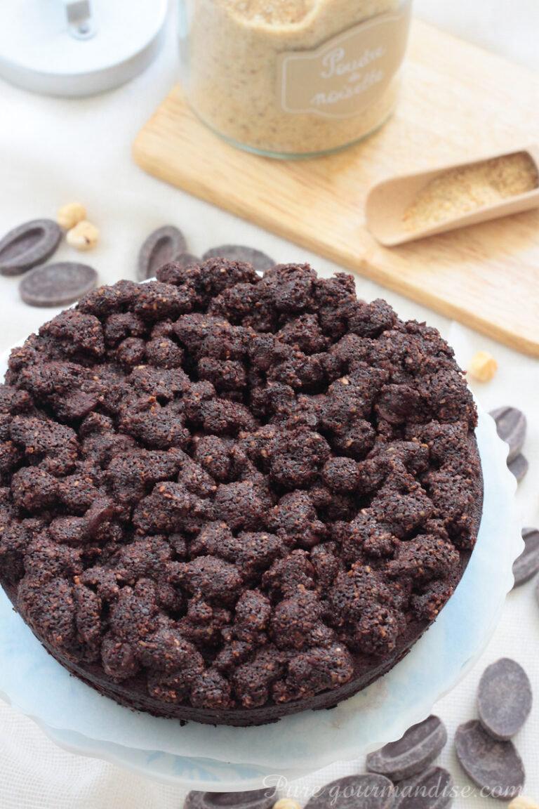 Le fondant au chocolat ? Un classique, mais de taille réduite, avec seulement 2 oeufs, et sans farine (donc sans gluten) : remplacée par un tout petit peu de poudre de noisette, pour aller avec le crumble. Je le cuis tout seul pendant 20 minutes avant de rajouter son crumble au-dessus et de le remettre au four. Cela le fait cuire tout en le laissant légèrement mi-cuit, avant de fixer son crumble au chocolat en surface.