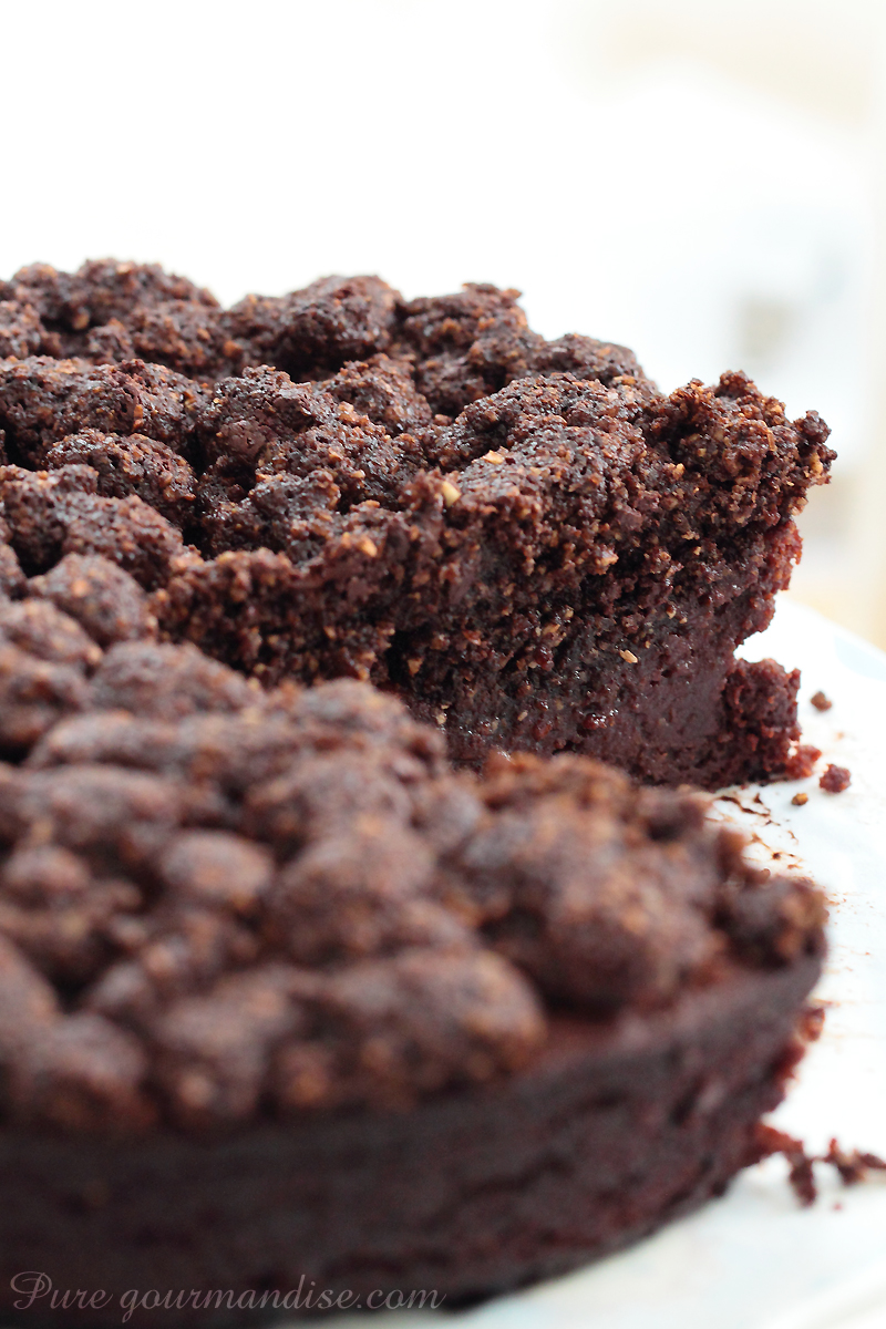 J’ai fait rire ma fille quand je lui ai dit que j’en avais rêvé la nuit : un fondant au chocolat en crumble. Un beau gâteau très fondant au chocolat surmonté d’un crumble lui aussi au chocolat. C’est rigolo parce qu’en plus ça ne pouvait être qu’une recette qui lui plaise vu qu’elle adore autant les crumbles que les fondants au chocolat. Combiner les deux ne pouvait que la combler. D’ailleurs, pourquoi n’y avais-je pas pensé plus tôt ?